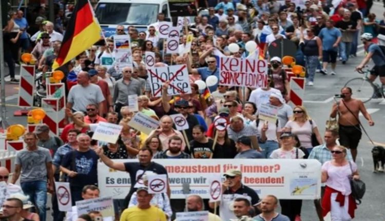 Köln şehir merkezindeki Roncalli Meydanı’nda bir araya gelen Moskova yanlıları, Rus ve Alman bayrakları taşıdı.