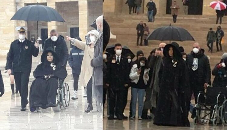 Sosyal medyada paylaşılan fotoğraflarda Anıtkabir ziyaretine tekerlekli sandalye ile gelen Ersoy’a bir askerin yağmurdan korunması için şemsiye tuttuğu görüldü. Bu durum ise sosyal medyada tepki topladı.
