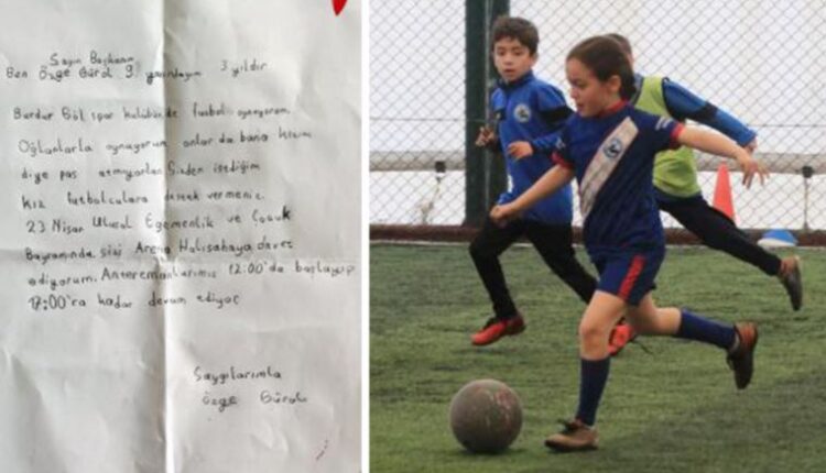 Burdur’da kız futbol takımı olmadığı için erkeklerle antrenman yapan ilkokul öğrencisi 9 yaşındaki Özge Gürol, erkekler pas vermeyince Belediye Başkanı Ali Orkun Ercengiz’e mektup yazıp yardım istedi, antrenmana davet etti.