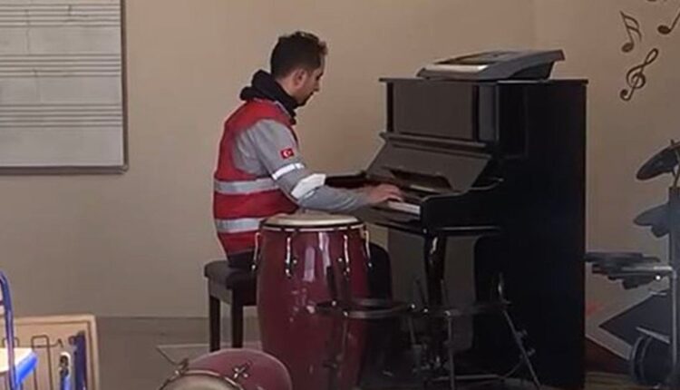 Kahramanmaraş merkezli depremlerin vurduğu şehirlerden Hatay’ın Antakya ilçesinde gönüllü görev yapan müzik öğretmeni Ozan Can Alkaya, sarsıntıda hafif hasar alan okulun müzik sınıfında piyano başına geçerek Erik Satie’nin ‘Gnossienne 1 notes’ bestesini çaldı.